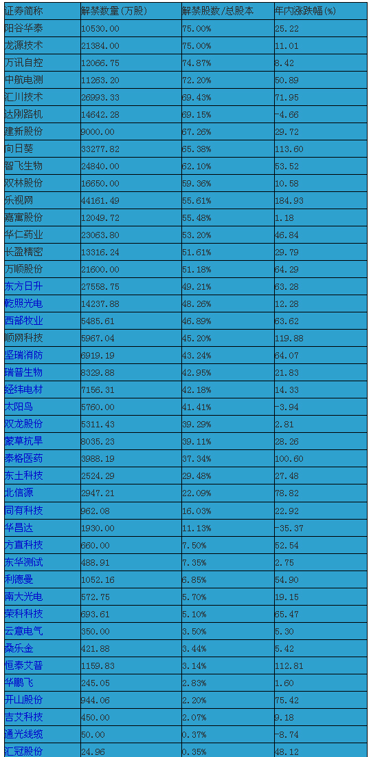 數(shù)據(jù)還顯示,在解禁比重超過50%的個股中,向日葵、樂視網(wǎng)年內(nèi)漲幅分別高達(dá)113.60%和184.93%;此外,解禁比重達(dá)45.20%的順網(wǎng)科技年內(nèi)漲幅也高達(dá)119.88%。