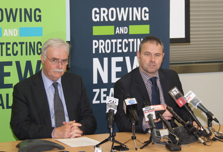 8月7日,新西蘭初級(jí)產(chǎn)業(yè)部負(fù)責(zé)食品安全事務(wù)的代理局長(zhǎng)斯科特·加拉赫(右)在新聞吹風(fēng)會(huì)上表示,雖然目前仍然無(wú)法排除嬰兒因服用遭污染的配方奶粉而患病的可能性,但新西蘭境內(nèi)已經(jīng)追溯到所有未銷售的可能遭污染的嬰幼兒配方奶粉。