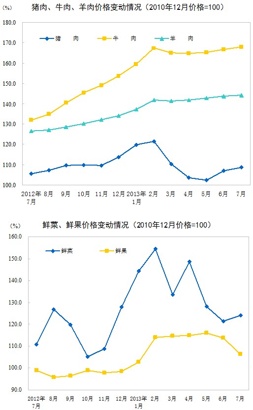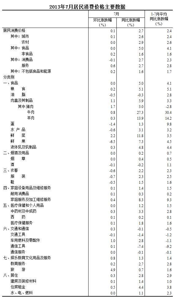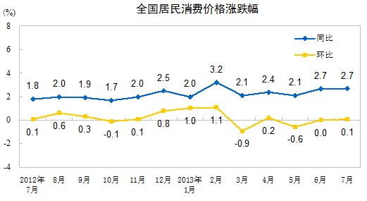 2013年7月份,全國居民消費價格總水平同比上漲2.7%。其中,城市上漲2.6%,農村上漲2.9%;食品價格上漲5.0%,非食品價格上漲1.6%;消費品價格上漲2.7%,服務價格上漲2.7%。1-7月平均,全國居民消費價格總水平比去年同期上漲2.4%。