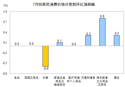 7月份,全國居民消費價格總水平環(huán)比上漲0.1%。其中,城市上漲0.1%,農村持平(漲跌幅度為0,下同);食品價格持平,非食品價格上漲0.2%;消費品價格下降0.1%,服務價格上漲0.6%。