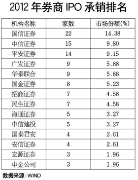WIND統(tǒng)計(jì)數(shù)據(jù)顯示,在IPO保薦項(xiàng)目上,2012年全年,中金公司僅保薦了隆鑫通用、廣汽集團(tuán)和吉艾科技,合計(jì)募集資金13.94億元,位列第17位;實(shí)現(xiàn)承銷(xiāo)及保薦費(fèi)用收入合計(jì)1.31億元,位列第11位。其主承銷(xiāo)(首發(fā)、增發(fā)、配股及可轉(zhuǎn)債)收入合計(jì)2.61億元,市場(chǎng)份額為3.78%,位列第9位。而在2005年-2007年期間,憑借著強(qiáng)大的政府背景和在大型項(xiàng)目上突出的業(yè)務(wù)實(shí)力,當(dāng)時(shí)的中金公司搶下了包括中國(guó)神華、中國(guó)人壽、建設(shè)銀行和工商銀行等許多大型項(xiàng)目的IPO,也為公司帶來(lái)了不菲的保薦和承銷(xiāo)費(fèi)用。即使在2009年,中金公司也以10.9億元摘取承銷(xiāo)收入第一的桂冠,市場(chǎng)份額為20.64%。2010年,隨著創(chuàng)業(yè)板的推出,中金公司在IPO承銷(xiāo)市場(chǎng)一落千丈,承銷(xiāo)收入縮水至7億元,市場(chǎng)份額為4.13%;2011年,中金公司業(yè)績(jī)?cè)俣瓤s水,IPO承銷(xiāo)收入降至1.68億元,市場(chǎng)份額下滑到1.27%。