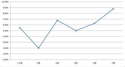 國家統(tǒng)計(jì)局?jǐn)?shù)據(jù)顯示,7月份工業(yè)增加值增速為9.7%,比上個月增速提高了0.8個百分點(diǎn),明顯高出此前機(jī)構(gòu)預(yù)測均值,環(huán)比增速也從上月的0.71%提高到0.88%。7月CPI增長2.7%,升幅較溫和;7月PPI同比下降2.3%;社會消費(fèi)品零售總額同比增長13.2%;7月制造業(yè)PMI升至50.3%。
