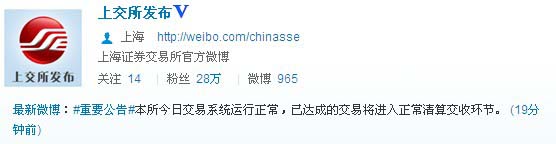 據(jù)上交所16日收盤后微博顯示,本所今日交易系統(tǒng)運(yùn)行正常,已達(dá)成的交易將進(jìn)入正常清算交收環(huán)節(jié)。