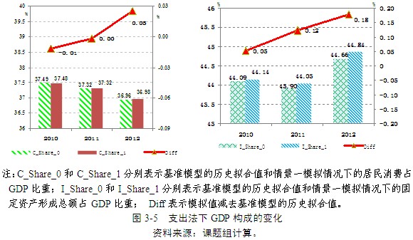 其次,宏觀經(jīng)濟(jì)結(jié)構(gòu)基本保持不變。在模擬的2010-2012年期間,居民消費(fèi)占GDP的比重基本維持不變;固定資產(chǎn)形成總額占GDP比重則小幅上升,分別增加了0.05、0.12和0.18個(gè)百分點(diǎn)(圖3-5)。
