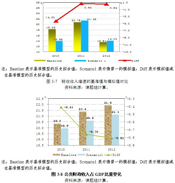 第三,由于減少的非稅收入增加了企業(yè)收入,企業(yè)自籌資金的投資增速相對(duì)基準(zhǔn)模型的歷史擬合值有較大的提高。2010-2012年,企業(yè)自籌資金的投資增速分別提高了0.93、0.79和0.19個(gè)百分點(diǎn)(圖3-6)。