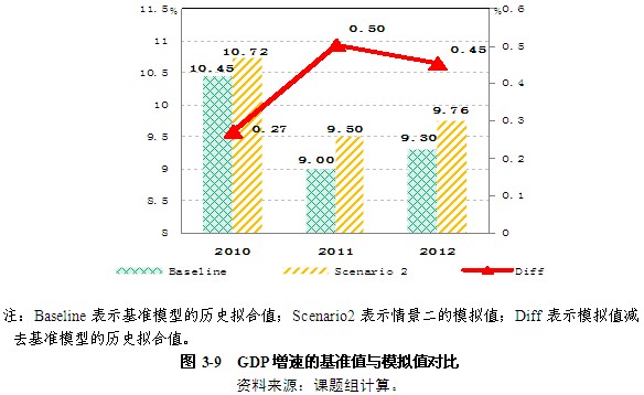 第三,得益于居民消費(fèi)需求的擴(kuò)大以及經(jīng)濟(jì)增長(zhǎng)的加快,企業(yè)自籌投資增速相較基準(zhǔn)模擬水平也有所提高。同時(shí),稅收收入增速也逐漸加快。與基準(zhǔn)模型的歷史擬合值相比,在2010-2012年期間,稅收收入增速先降低3.98百分點(diǎn),之后提高1.12、0.78個(gè)百分點(diǎn)(圖3-11)。財(cái)政總收入占GDP的比重分別下降0.4、0.78和0.89個(gè)百分點(diǎn)(圖3-12)。