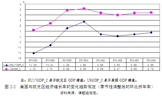 2013年上半年,歐元區(qū)經(jīng)濟(jì)依然增長乏力,第一季度經(jīng)濟(jì)增長萎縮了1.1%(季節(jié)性調(diào)整后的環(huán)比折年率)。預(yù)計上半年歐元區(qū)經(jīng)濟(jì)依然處在減速的期間。國際貨幣基金組織(IMF)2013年7月預(yù)測歐元區(qū)2013年增長率為-0.6%,遠(yuǎn)遠(yuǎn)低于其年初的預(yù)測值(-0.2%)。另一方面,伴隨著失業(yè)率的緩慢下降以及私人住房消費(fèi)支出的增長,美國經(jīng)濟(jì)增長正在穩(wěn)步復(fù)蘇之中。按季節(jié)性調(diào)整后的環(huán)比折年率看,2013年第一季度美國經(jīng)濟(jì)增長1.1%,第二季度進(jìn)一步提高到1.7%。IMF預(yù)計2013年美國經(jīng)濟(jì)可能增長1.7%。⑶2014年全球經(jīng)濟(jì)應(yīng)持續(xù)好轉(zhuǎn),IMF預(yù)計歐元區(qū)經(jīng)濟(jì)將增長0.9%,美國經(jīng)濟(jì)將增長2.7%。以此為前提,課題組假定美國和歐元區(qū)經(jīng)濟(jì)在下半年會有一個較明顯的加速;