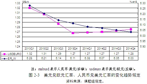 根據(jù)上述對歐元區(qū)以及美國經(jīng)濟(jì)前景的預(yù)測,預(yù)計2013年下半年歐元兌美元依然維持貶值的態(tài)勢,至第四季度末,歐元兌美元的匯率可能跌至1:1.27的水平;2014年隨著歐元區(qū)經(jīng)濟(jì)走勢趨于平穩(wěn),全年歐元兌美元的匯率可以維持在1:1.28的水平。在人民幣匯率方面,人民幣長期升值的趨勢仍難以根本改變,但是短期內(nèi)人民幣雙向浮動的可能性更大。受全球經(jīng)濟(jì)前景不確定的影響,中國出口增速將放緩,貿(mào)易順差繼續(xù)收窄,資本流入減緩。這些因素都將減輕人民幣升值壓力,人民幣升值的速度也將有所放緩。預(yù)計至2013年末,美元兌人民幣匯率將為1:6.11,2014年末可能達(dá)到1:6.03的水平(圖2-3)。