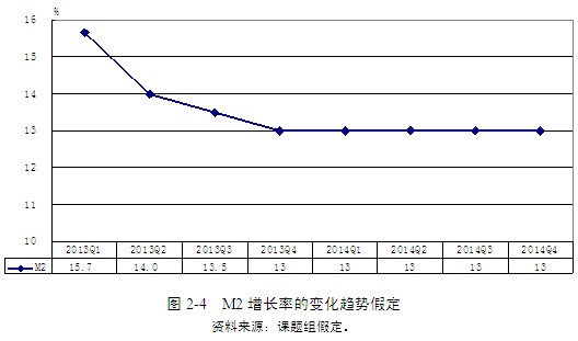 上半年實體經(jīng)濟(jì)的減速削弱了對制造業(yè)等實體經(jīng)濟(jì)的投資需求,新增人民幣貸款中用于房地產(chǎn)行業(yè)投資的比重大幅度上升。為避免資產(chǎn)市場價格的攀升,預(yù)計下半年貨幣政策的執(zhí)行將會“嚴(yán)控增量、盤活存量”,并保持“穩(wěn)健趨緊”的態(tài)勢。課題組假定,2013年第三季度M2的同比增速可能降至13.5%,之后將維持13%的增速(圖2-4)。此外,至2014年底,貸款基準(zhǔn)利率也將繼續(xù)維持在6%的現(xiàn)行水平。