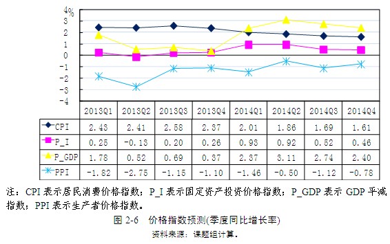 2013年固定資產(chǎn)投資價(jià)格指數(shù)(P_I)預(yù)計(jì)為0.14%,比上年下降0.96個(gè)百分點(diǎn);2014年P(guān)_I可能回升至0.71%的水平。同比分季度看,2013年第三季度可能達(dá)到0.20%,第四季度小幅上升到0.26%;2014年第一季度該指數(shù)可能繼續(xù)上升至0.93%,第二季度仍維持在0.92%,第三季度則下跌到0.52%,并于第四季度進(jìn)一步下降至0.46%(圖2-6)。