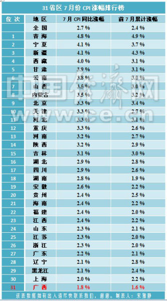 31省區(qū)7月份CPI漲幅排行榜,青海第一,廣西居末,全國僅剩廣西物價處“1時代”。制表人 宋雅靜