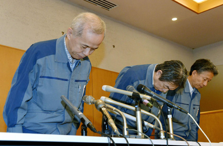 26日,東京電力公司總裁広瀬奈央美(左)在奈良縣福島復(fù)興總部的新聞發(fā)布會上為核污水泄漏事件鞠躬謝罪。東京電力公司表示,將邀請外國專家協(xié)助處理泄漏的高輻射核污水。日本有關(guān)方面稱,可能需要投入36億美元用于核污水清理。