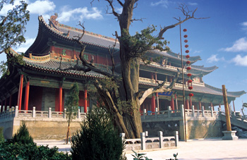 廣運殿前庭院四角有四株奇樹,分別是柏抱楸、柏抱槐、鳴鹿柏、夜笑柏。柏抱楸,樹身數(shù)圍,每年四五月間,柏枝叢中盛開紅楸花,蔚為奇觀。柏抱槐,據(jù)傳1000多年前從西安慈恩寺移來,每逢初夏柏樹叢中槐花盛開,芳香四溢。鳴鹿柏,直徑2米以上,傳說唐代建寢宮塑像時,突然跑來一對梅花鹿,在此樹下嘶鳴,故稱之為鳴鹿柏。夜笑柏,傳說此柏系一僧從印度移植而來,晝伏夜長,長勢緩慢,樹壽綿長。每到臘月三十夜晚,此樹沙沙作響,頗似人們的笑語之聲。這四株古柏樹齡均在1600年至2000年之間以上。