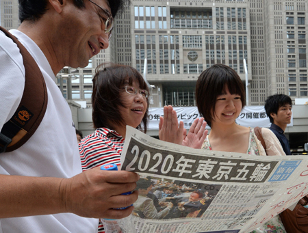 8日,日本民眾在東京都政府大樓門前閱讀日本媒體為東京成功申辦2020年奧運(yùn)會印刷的號外。阿根廷布宜諾斯艾利斯時間7日晚,在國際奧委會第125次全會上,經(jīng)過兩輪投票和近一個半小時的等待,東京最終獲得主辦權(quán)。日本首相安倍晉三在隨后舉行的新聞發(fā)布會上表示,舉辦奧運(yùn)會無疑有助于日本經(jīng)濟(jì)持續(xù)增長。有報告預(yù)測,2020年東京奧運(yùn)會可能幫助日本國內(nèi)生產(chǎn)總值(GDP)增長4.2萬億日元(約423.9億美元)。