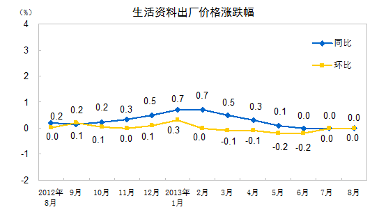 2013年8月份,全國(guó)工業(yè)生產(chǎn)者出廠價(jià)格同比下降1.6%,環(huán)比上漲0.1%。工業(yè)生產(chǎn)者購(gòu)進(jìn)價(jià)格同比下降1.6%,環(huán)比上漲0.1%。1-8月平均,工業(yè)生產(chǎn)者出廠價(jià)格同比下降2.2%,工業(yè)生產(chǎn)者購(gòu)進(jìn)價(jià)格同比下降2.3%。