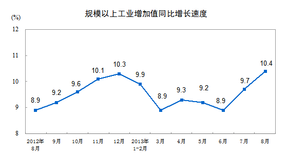 國家統(tǒng)計(jì)局10日公布數(shù)據(jù),2013年8月份,規(guī)模以上工業(yè)增加值同比實(shí)際增長10.4%(以下增加值增速均為扣除價(jià)格因素的實(shí)際增長率),比7月份加快0.7個(gè)百分點(diǎn)。從環(huán)比看,8月份,規(guī)模以上工業(yè)增加值比上月增長0.93%。1-8月,規(guī)模以上工業(yè)增加值同比增長9.5%。