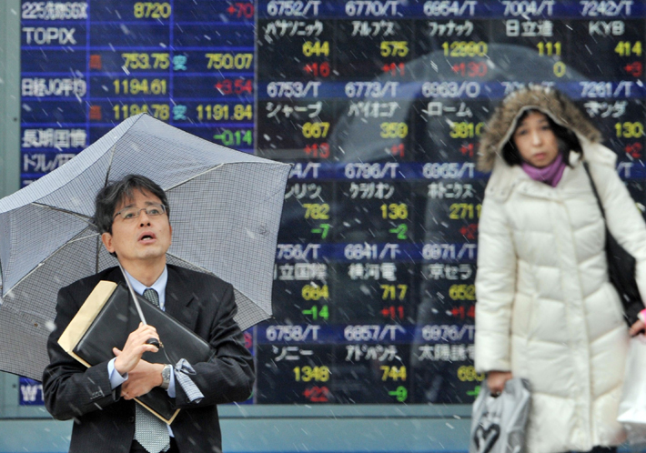 圖為日本首都東京街頭,人們走過(guò)股市信息顯示牌。新華/法新 |