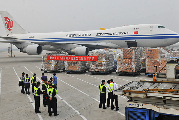 近日,中國政府決定向發(fā)生地震的巴基斯坦提供人道主義救災(zāi)物資援助,并交由中國國際航空股份有限公司(簡稱“國航”)所屬的中國國際貨運(yùn)航空有限公司(以下簡稱“國貨航”)執(zhí)行。9月28日16時(shí)09分,滿載救援物資的CA1093航班B2458號(hào)貨機(jī)從北京首都國際機(jī)場起飛前往巴基斯坦,于北京時(shí)間22時(shí)30分抵達(dá)巴基斯坦南部城市卡拉奇,機(jī)上裝載了凈水設(shè)備、發(fā)電機(jī)、毛毯、帳篷、藥品等災(zāi)區(qū)急需的生產(chǎn)和生活物資。隨后,另一架運(yùn)送中國政府緊急人道主義救援物資的波音747-400型B2476號(hào)貨機(jī),也于18時(shí)37分執(zhí)行CA1095航班從北京首都國際機(jī)場起飛,于北京時(shí)間29日0時(shí)57分抵達(dá)巴基斯坦南部城市卡拉奇。