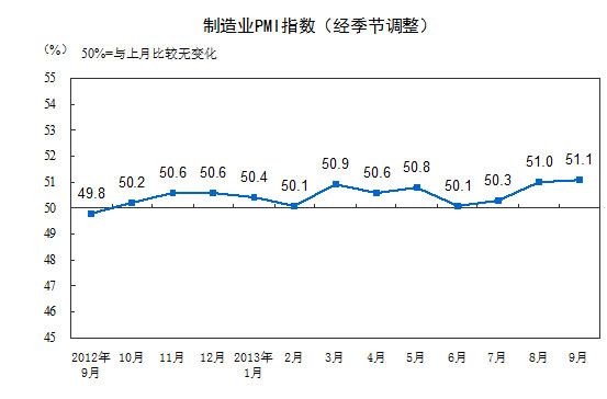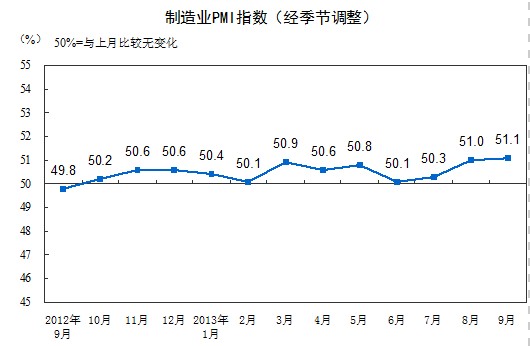 2013年9月,構(gòu)成制造業(yè)PMI的5個(gè)分類指數(shù)4升1降。