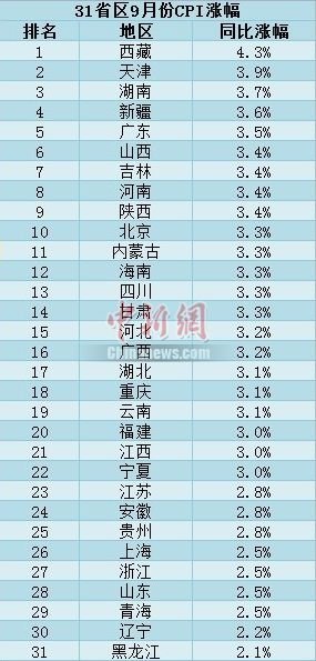 中新網(wǎng)記者梳理發(fā)現(xiàn),與全國3.1%的漲幅相比,西藏、天津、湖南、新疆、廣東、山西、吉林、河南、陜西、北京、內(nèi)蒙古、海南、四川、甘肅、河北、廣西這16個(gè)省區(qū)市的9月份CPI漲幅超過了全國水平。