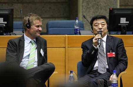 10月28日,中國石化總裁李春光(右)在領(lǐng)導(dǎo)力圓桌會(huì)議上回答提問。新華社記者孟晨光攝
