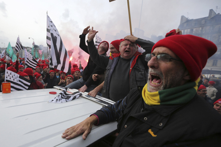 當(dāng)?shù)貢r(shí)間11月2日,在法國布列塔尼地區(qū)菲尼斯泰爾省省會坎佩爾,人們戴著抗稅斗爭象征的紅色便帽參加示威游行,抗議政府計(jì)劃開征“環(huán)保稅”,要求就業(yè)權(quán)。這個(gè)稅種由上屆薩科齊政府主張制定,原定于明年1月1日實(shí)施。法國總理埃羅當(dāng)日呼吁民眾不要使用暴力手段來解決該地區(qū)面臨的失業(yè)、經(jīng)濟(jì)蕭條和引發(fā)爭議的“環(huán)保稅”等問題,表示政府將繼續(xù)與民意代表以及經(jīng)濟(jì)界人士對話,尋求該地區(qū)發(fā)展之道。
