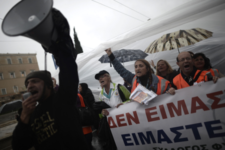 希臘工人6日舉行全國性24小時大罷工,抗議政府實行財政緊縮政策,公共服務部門基本癱瘓。由于交通部門工人罷工,航運以及其他交通運輸幾乎停頓。同時,國際借貸方目前正在考慮是否向希臘進一步發(fā)放救援資金。圖為抗議者冒雨在希臘首都雅典游行。