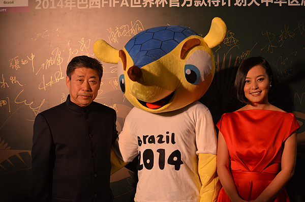 國際足聯(lián)執(zhí)委張吉龍先生(左)、盛開國際體育董事長李紅女士(右)與巴西世界杯吉祥物人偶在啟動(dòng)儀式上合影。