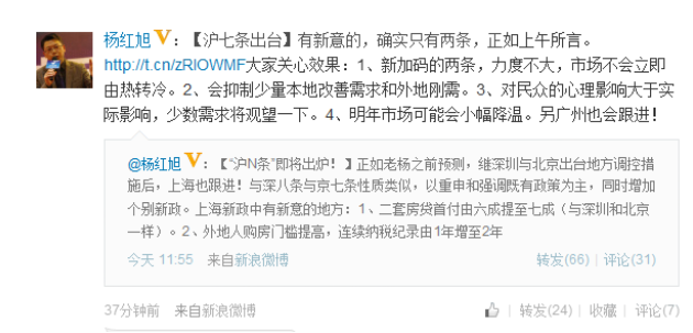 他在微博中分析道,1、新加碼的兩條,力度不大,市場不會立即由熱轉(zhuǎn)冷。2、會抑制少量本地改善需求和外地剛需。3、對民眾的心理影響大于實際影響,少數(shù)需求將觀望一下。4、明年市場可能會小幅降溫。另廣州也會跟進(jìn)!