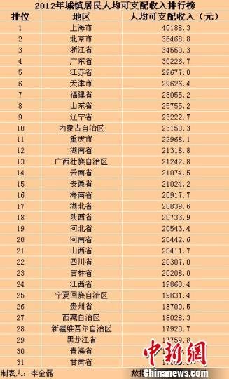 結(jié)果顯示,上海、北京、浙江這3個地區(qū)位列前三名。其中,上海2012年城鎮(zhèn)居民人均可支配收入最高,達到了40188.3元。北京排名第二,為36468.8元;浙江排名第三,為34550.3元。