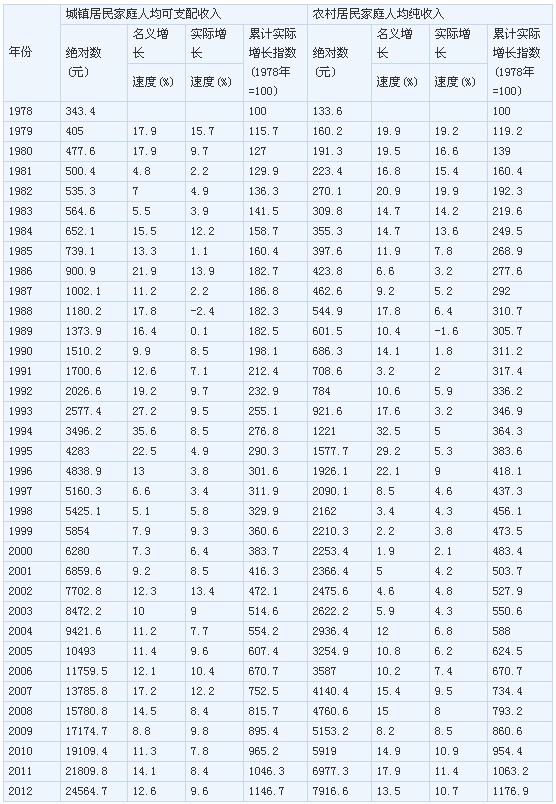 根據(jù)國(guó)家統(tǒng)計(jì)局每年對(duì)十幾萬戶居民家庭的直接調(diào)查結(jié)果,從1978年到2012年,扣除物價(jià)上漲因素后,全國(guó)城鎮(zhèn)居民人均可支配收入實(shí)際增長(zhǎng)10.5倍,年均實(shí)際增長(zhǎng)7.4%;全國(guó)農(nóng)村居民人均純收入實(shí)際增長(zhǎng)10.8倍,年均實(shí)際增長(zhǎng)7.5%。