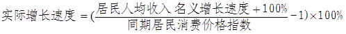 實(shí)際增長(zhǎng)速度。主要反映居民持有貨幣收入所能形成的實(shí)際購(gòu)買力增減變化情況。計(jì)算方法是在居民人均收入名義增長(zhǎng)速度中扣除同期的居民消費(fèi)價(jià)格指數(shù)。計(jì)算公式為: