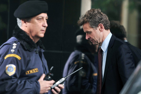 國(guó)際貨幣基金組織(IMF)希臘紓困項(xiàng)目負(fù)責(zé)人波爾·湯姆森(右)18日從位于雅典的希臘財(cái)政部?jī)?nèi)走出。當(dāng)日,希臘財(cái)長(zhǎng)斯圖納拉斯會(huì)見(jiàn)了“三駕馬車(chē)”(歐盟、IMF以及歐洲央行)的代表,就未來(lái)一年希臘的財(cái)政預(yù)算交流了看法。斯圖納拉斯表示,目前希臘方面與“三駕馬車(chē)”,就2014年財(cái)政預(yù)算是否存在還需要進(jìn)一步救助資金填補(bǔ)的缺口一事,尚未達(dá)成一致意見(jiàn),但“最終會(huì)有一個(gè)解決辦法”。據(jù)悉,希臘政府將于21日提交2014年預(yù)算案。