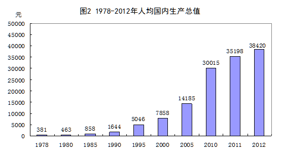 人均國內(nèi)生產(chǎn)總值不斷提高,成功實(shí)現(xiàn)從低收入國家向上中等收入國家的跨越。1978年人均國內(nèi)生產(chǎn)總值僅有381元,1987年達(dá)到1112元,1992年達(dá)到2311元,2003年超過萬元大關(guān)至10542元,2007年突破2萬元至20169元,2010年再次突破3萬元大關(guān)至30015元,2012年人均國內(nèi)生產(chǎn)總值達(dá)到38420元,扣除價(jià)格因素,比1978年增長16.2倍,年均增長8.7%。人均國民總收入也實(shí)現(xiàn)同步快速增長,根據(jù)世界銀行數(shù)據(jù),我國人均國民總收入由1978年的190美元上升至2012年的5680美元,按照世界銀行的劃分標(biāo)準(zhǔn),已經(jīng)由低收入國家躍升至上中等收入國家,對(duì)于我國這樣一個(gè)經(jīng)濟(jì)發(fā)展起點(diǎn)低、人口基數(shù)龐大的國家,能夠取得這樣的進(jìn)步確實(shí)難能可貴。