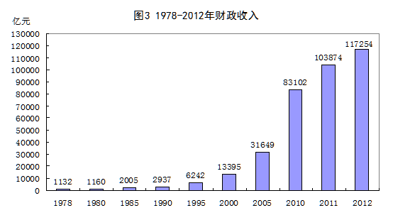 國家財(cái)政實(shí)力明顯增強(qiáng),政府對(duì)經(jīng)濟(jì)和社會(huì)發(fā)展的調(diào)控能力日益增強(qiáng)。1978年國家財(cái)政收入僅1132億元,1985年翻了近一番,達(dá)到2005億元,1993年再翻一番,達(dá)到4349億元,1999年跨上1萬億臺(tái)階,達(dá)到11444億元,2007年超過5萬億元,達(dá)到51322億元,2011年再次超過10萬億元,2012年,我國財(cái)政收入達(dá)到117254億元,比1978年增長103倍,年均增長14.6%。財(cái)力的增加對(duì)我國促進(jìn)經(jīng)濟(jì)發(fā)展、加強(qiáng)社會(huì)保障、減小城鄉(xiāng)差距、切實(shí)改善民生、有效應(yīng)對(duì)各類沖擊提供了有力的資金保障。