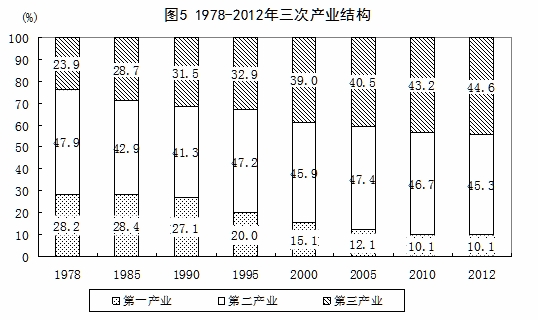 產(chǎn)業(yè)結(jié)構(gòu)不斷優(yōu)化。35年來,三次產(chǎn)業(yè)在調(diào)整中均得到長足發(fā)展,農(nóng)業(yè)基礎(chǔ)地位不斷強(qiáng)化,工業(yè)實(shí)現(xiàn)持續(xù)快速發(fā)展,服務(wù)業(yè)迅速發(fā)展壯大。1979-2012年,第一、二、三產(chǎn)業(yè)增加值年均實(shí)際分別增長4.6%、11.3%和10.8%。三次產(chǎn)業(yè)增加值在國內(nèi)生產(chǎn)總值中所占的比例由1978年的28.2:47.9:23.9調(diào)整為2012年的10.1:45.3:44.6。與1978年相比,2012年第一產(chǎn)業(yè)比重下降18.1個(gè)百分點(diǎn),第二產(chǎn)業(yè)比重下降2.6個(gè)百分點(diǎn),第三產(chǎn)業(yè)比重大幅上升20.7個(gè)百分點(diǎn)。