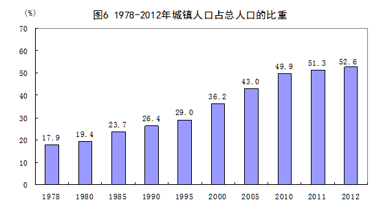 城鎮(zhèn)化步伐明顯加快。城鎮(zhèn)化水平由1978年的17.9%上升到2012年的52.6%,上升了34.7個(gè)百分點(diǎn),年均上升1.0個(gè)百分點(diǎn)。城鎮(zhèn)總?cè)丝谀昃黾?586萬人,鄉(xiāng)村總?cè)丝谀昃鶞p少435萬人。城鎮(zhèn)化水平的提升促進(jìn)了城鄉(xiāng)經(jīng)濟(jì)的協(xié)調(diào)發(fā)展,有利于居民消費(fèi)結(jié)構(gòu)升級(jí),并不斷催生新的經(jīng)濟(jì)增長點(diǎn),是擴(kuò)大內(nèi)需的最大潛力所在。隨著城鎮(zhèn)化和工業(yè)化進(jìn)程的加快,城鎮(zhèn)吸納就業(yè)的能力也不斷增強(qiáng)。城鎮(zhèn)就業(yè)人員占全國的比重從1978年的23.7%上升到2012年的48.4%,鄉(xiāng)村就業(yè)人員占比從76.3%下降51.6%。