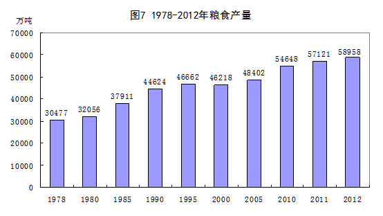 農(nóng)產(chǎn)品供給不僅解決了占世界五分之一人口的溫飽問題,還為工業(yè)化快速推進(jìn)提供了重要支撐。35年來,黨中央、國務(wù)院始終把農(nóng)業(yè)生產(chǎn)放在十分重要的戰(zhàn)略地位,千方百計(jì)促進(jìn)農(nóng)業(yè)生產(chǎn),穩(wěn)定糧食產(chǎn)量,不僅成功解決了中國人的溫飽問題,實(shí)現(xiàn)了人民生活水平質(zhì)的提高,而且為工業(yè)發(fā)展提供了豐富的原料。2012年,糧食產(chǎn)量達(dá)到58958萬噸,比1978年增長93.5%,2004年以來實(shí)現(xiàn)“九連增”,連續(xù)6年穩(wěn)定在5億噸以上的水平;棉花產(chǎn)量684萬噸,比1978年增長2.2倍;油料產(chǎn)量3437萬噸,增長5.6倍;糖料產(chǎn)量13485萬噸,增長4.7倍;水果產(chǎn)量24057萬噸,增長35.6倍;水產(chǎn)品產(chǎn)量5908萬噸,增長11.7倍。肉類產(chǎn)量8387萬噸,比1979年增長6.9倍。2011年,谷物、肉類、籽棉、花生、茶葉、水果產(chǎn)量穩(wěn)居世界第一位,油菜籽、甘蔗、大豆分列第二、三、四位。從人均水平看,2012年人均糧食產(chǎn)量達(dá)到436.5公斤,比1978年增長36.9%;人均棉花、油料、糖料、水產(chǎn)品產(chǎn)量分別達(dá)到5.1公斤、25.4公斤、99.8公斤和43.7公斤,分別增長1.2倍、3.7倍、3.0倍和8.0倍。
