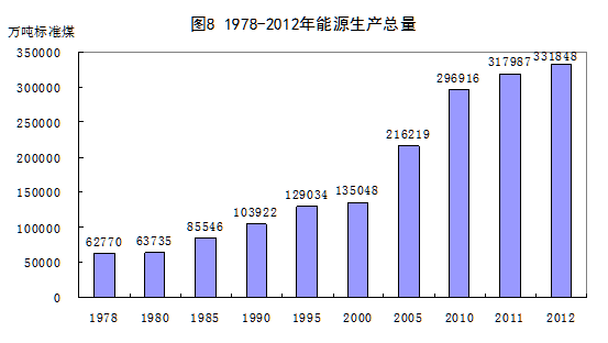 能源生產(chǎn)能力不斷提高。隨著工業(yè)化的推進(jìn),我國逐漸成為能源消費(fèi)大國,與此同時(shí),能源生產(chǎn)能力也不斷提升,能源自給率保持較高水平,一定程度上保證了國家經(jīng)濟(jì)安全。2012年,我國能源生產(chǎn)總量達(dá)到33.2億噸標(biāo)準(zhǔn)煤,比1978年增長4.3倍,年均增長5.0%。同期,我國能源消費(fèi)總量年均增長5.6%,與能源生產(chǎn)增速的差距不大,能源總自給率達(dá)到90%以上。能源生產(chǎn)結(jié)構(gòu)不斷優(yōu)化,水電、核電、風(fēng)電等清潔能源和可再生能源生產(chǎn)量在能源生產(chǎn)總量中的比重由1978年的3.1%提高到2012年的10.3%。
