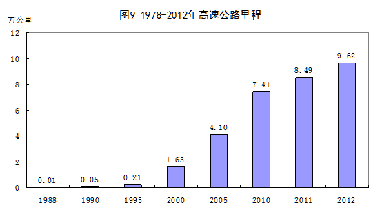 交通運(yùn)輸設(shè)施日益完善。35年來,我國交通網(wǎng)絡(luò)不斷完善,運(yùn)輸能力不斷增強(qiáng),運(yùn)輸效率不斷提高,有力地支撐了各項(xiàng)產(chǎn)業(yè)的發(fā)展。2012年,我國鐵路營業(yè)里程達(dá)到9.8萬公里,比1978增長88.8%,居世界第二位;公路里程424萬公里,增長3.8倍;民用航空航線里程328萬公里,增長21.0倍;輸油(氣)管道里程9萬公里,增長9.9倍;沿海主要港口貨物吞吐量66.5億噸,增長32.5倍,連續(xù)多年居世界第一。一些現(xiàn)代化交通運(yùn)輸設(shè)施從無到有,增長迅猛。改革開放之初我國尚無高速公路,2012年,我國高速公路里程達(dá)到9.62萬公里,位居世界第二。高速鐵路飛速發(fā)展,生產(chǎn)出時(shí)速高達(dá)350公里的動(dòng)車組,標(biāo)志著我國鐵路運(yùn)輸達(dá)到國際先進(jìn)水平,2012年,高鐵運(yùn)營里程達(dá)9356公里,居世界第一位。