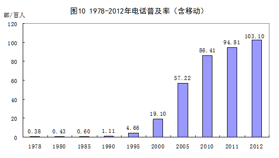 郵電通信業(yè)突飛猛進(jìn)。35年來,我國郵電通信業(yè)規(guī)模不斷擴(kuò)大,服務(wù)種類不斷豐富,推動(dòng)我國信息化水平不斷提高。郵政營業(yè)網(wǎng)點(diǎn)由1978年的5.0萬處擴(kuò)張到2012年的9.6萬處,增長92.6%;郵路總長度由1985年的142萬公里提高到586萬公里,增長3.1倍;2012年,全國通郵的行政村比重達(dá)到99.1%。固定長途電話交換機(jī)容量由1978年的0.2萬路端提高到2012年的1580萬路端,增長8479倍;局用交換機(jī)容量由406萬門提高到43749萬門,增長106.8倍。固定電話用戶由192.5萬戶提高到2.8億戶,增長143.5倍;電話普及率由1978年的每百人0.38部提高到2012年的每百人103.10部;移動(dòng)電話業(yè)務(wù)從無到有,手機(jī)已由上世紀(jì)九十年代的奢侈品變?yōu)楝F(xiàn)在的生活必需品,2012年普及率達(dá)到每百人82.50部,幾乎達(dá)到了所有成年人人手一部的水平;ヂ(lián)網(wǎng)設(shè)施迅猛發(fā)展,互聯(lián)網(wǎng)普及率由2002年的4.6%迅速提高到2012年的42.1%。