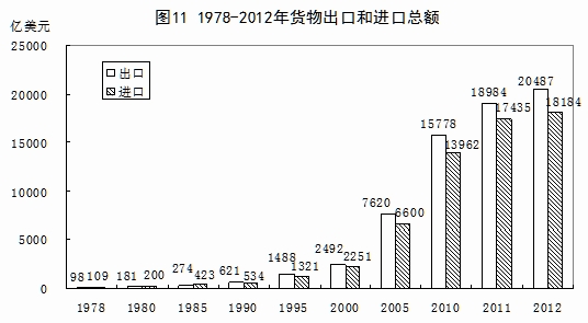 對(duì)外貿(mào)易總量不斷攀升。改革開放初期,我國對(duì)外經(jīng)濟(jì)交流活動(dòng)十分有限,再加上國內(nèi)市場(chǎng)化水平不高,造成了與國際市場(chǎng)相對(duì)隔絕的狀態(tài)。1978年,我國貨物進(jìn)出口總額只有206億美元,世界排名第29位,1988年突破了1000億美元,1994年突破了2000億美元,1997年突破了3000億美元,2004年又突破了1萬億美元大關(guān),2012年,貨物進(jìn)出口總額已達(dá)到38671億美元,比1978年增長186倍,年均增長16.6%,僅次于美國,位居世界第二位;貨物出口總額20487億美元,增長209倍,年均增長17.0%,居世界第一位;貨物進(jìn)口總額18184億美元,增長166倍,年均增長16.2%,居世界第二位。2012年,我國貨物出口總額和進(jìn)口總額分別占世界的11.2%和9.8%。
