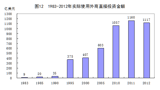 引進(jìn)外資與對(duì)外投資活動(dòng)日益頻繁。改革開放以來,我國充分發(fā)揮了資源、勞動(dòng)力等要素優(yōu)勢(shì)和巨大的潛在市場(chǎng)優(yōu)勢(shì),成為國際直接投資的熱土,利用外資規(guī)模不斷擴(kuò)大,外商直接投資成為推動(dòng)我國經(jīng)濟(jì)發(fā)展和技術(shù)進(jìn)步的重要力量。1979-2012年,實(shí)際使用外商直接投資12761億美元,1984-2012年以年均18.0%的高速度增長。我國已連續(xù)多年成為吸收外商直接投資最多的發(fā)展中國家,世界排名也上升至第二位。近些年來,隨著我國企業(yè)實(shí)力的提升,“走出去”的步伐開始加大。中國對(duì)外直接投資凈額由2007年的265億美元快速提高到2012年的878億美元,2012年末對(duì)外直接投資存量達(dá)到5319億美元。
