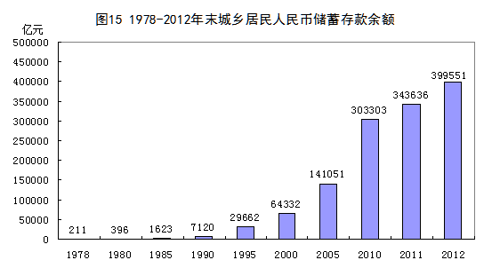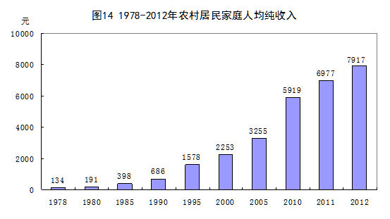 城鄉(xiāng)居民收入顯著提高。35年來,黨中央、國務(wù)院深化收入分配制度改革,努力實(shí)現(xiàn)居民收入增長和經(jīng)濟(jì)發(fā)展同步、勞動(dòng)報(bào)酬增長和勞動(dòng)生產(chǎn)率提高同步,效率和公平兼顧,確保了城鄉(xiāng)居民收入和財(cái)富的快速增長。2012年,城鎮(zhèn)居民人均可支配收入24565元,比1978年增長71倍,年均增長13.4%,扣除價(jià)格因素,年均增長7.4%;農(nóng)村居民人均純收入7917元,增長58倍,年均增長12.8%,扣除價(jià)格因素,年均增長7.5%。城鄉(xiāng)居民擁有的財(cái)富顯著增加。2012年末,城鄉(xiāng)居民人民幣儲(chǔ)蓄存款余額39.96萬億元,比1978年末增長1896倍,年均增長24.9%。股票、債券等金融資產(chǎn)規(guī)模不斷擴(kuò)大。城鎮(zhèn)居民擁有的財(cái)產(chǎn)性收入從無到有,2012年占人均全部年收入比重上升到2.6%。