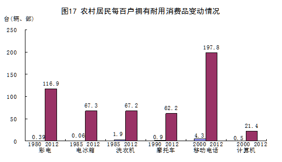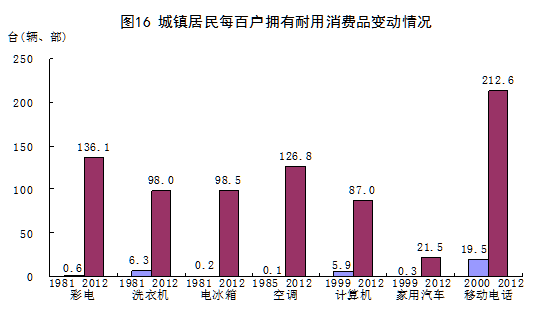 居民生活水平和質(zhì)量極大改善。2012年,城鎮(zhèn)居民人均現(xiàn)金消費(fèi)支出16674元,比1978年增長52.6倍,年均名義增長12.4%;農(nóng)村居民人均消費(fèi)支出5908元,增長49.9倍,年均名義增長12.3%。城鄉(xiāng)居民消費(fèi)結(jié)構(gòu)明顯優(yōu)化。2012年,城鎮(zhèn)居民恩格爾系數(shù)為36.2%,比1978年下降21.3個(gè)百分點(diǎn);農(nóng)村居民恩格爾系數(shù)為39.3%,下降28.4個(gè)百分點(diǎn)。居住條件極大改善。2012年,城鎮(zhèn)居民人均住宅建筑面積32.9平方米,比1978年增加26.2平方米;農(nóng)村居民人均住房面積37.1平方米,增加29.0平方米。消費(fèi)領(lǐng)域不斷拓展,物質(zhì)生活極大豐富。彩電、電冰箱、空調(diào)、電話等耐用消費(fèi)品逐步普及,汽車、電腦等高檔耐用消費(fèi)品擁有量大幅提高。2012年末,城鎮(zhèn)居民家庭平均每百戶移動(dòng)電話、計(jì)算機(jī)和家用汽車擁有量分別為212.6部、87.0臺(tái)和21.5輛,分別比2000年末增加193.1部、77.3臺(tái)和21.0輛。