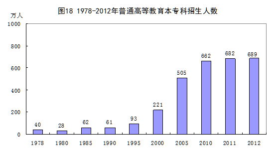 教育事業(yè)成績(jī)顯著。30多年來,黨中央、國務(wù)院堅(jiān)持教育優(yōu)先發(fā)展的戰(zhàn)略,不斷加大教育投入力度,深化教育領(lǐng)域綜合改革,大力促進(jìn)教育公平,取得了一系列成績(jī)。教育普及程度明顯提高,城鄉(xiāng)免費(fèi)九年義務(wù)教育全面實(shí)現(xiàn)。國民受教育程度大幅提升。6歲及以上人口平均受教育年限由1982年的5.2年提高到2012年的8.9年。2012年,普通高等教育本專科招生人數(shù)689萬人,比1978年增長16.1倍;在校生2391萬人,增長26.9倍;畢業(yè)生625萬人,增長36.9倍,較好地滿足了經(jīng)濟(jì)社會(huì)發(fā)展對(duì)各類人才的需求。