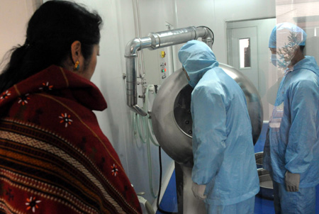 專家學(xué)者、宗教界人士和醫(yī)護(hù)人員代表日前齊聚一堂,共同慶祝北京藏醫(yī)院成立20周年,并參觀北京藏醫(yī)院新設(shè)立在北京市昌平區(qū)南口鎮(zhèn)的藏藥研究和加工機(jī)構(gòu)。目前,北京藏醫(yī)院制作了500余種藏藥材標(biāo)本,根據(jù)國家要求開始制定藏藥標(biāo)準(zhǔn),旨在為藏醫(yī)藥發(fā)展打下堅(jiān)實(shí)的基礎(chǔ)。圖為與會(huì)者在參觀北京藏醫(yī)院南口基地的藏藥生產(chǎn)。