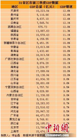 國家統(tǒng)計局公布的數(shù)據(jù)顯示,天津和貴州的前三季度GDP增速最高,均為12.6%;重慶以12.4%排名第三;而北京和上海前三季度GDP增速同為7.7%,排名墊底。