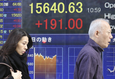 圖為28日,在日本東京,行人經(jīng)過(guò)一家證券公司外的電子股票顯示屏。