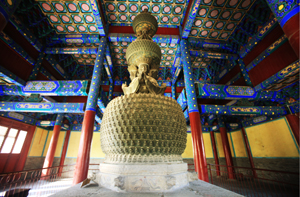 中國古代最精美的銅鑄毗盧佛 毗盧殿位于隆興寺中軸線最末端,殿內(nèi)的毗盧佛堪稱國寶,毗盧佛設(shè)計獨特,精美絕倫,為明萬歷皇帝朱翊鈞為其生母慈圣皇太后祝壽所御制的。這尊毗盧佛全部為青銅鑄造,高6.72米,由三層坐式毗盧佛和三層圓鼓形蓮座層置而成。三層蓮座的千葉蓮瓣上均鑄有一坐式小佛,表情、手印富于變化,整尊造像上共計大小佛像1072尊。這尊皇家御制的毗盧佛真實地反映了當(dāng)時的銅鑄工藝,據(jù)有極高的歷史、科學(xué)、藝術(shù)價值,堪稱海內(nèi)孤例。